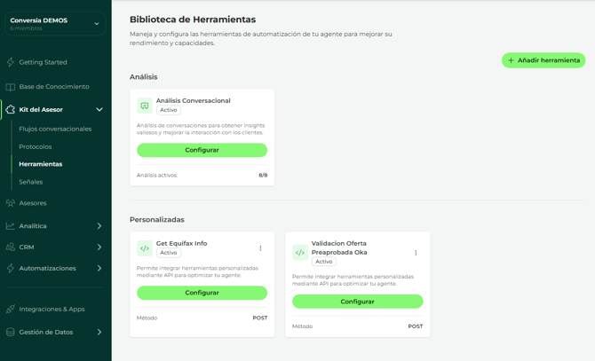 - Herramientas Personalizadas (Custom Tools): integraciones con sistemas externos mediante API. Requieren configuración técnica y tienen un costo adicional. Se coordinan con el equipo de Conversia.