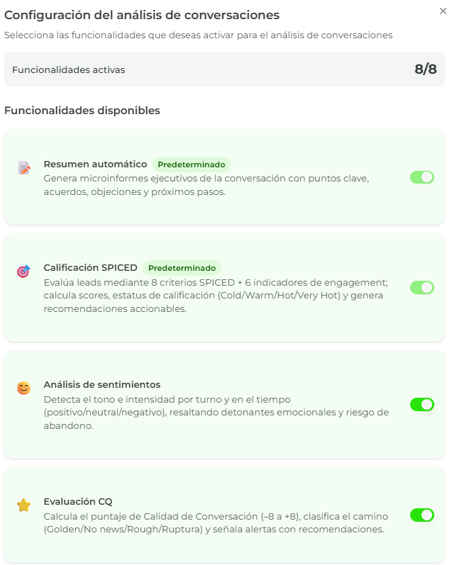 📍 Dónde se configura Se vincula a nivel de cuenta — no por asesor individual. Esto significa que las funcionalidades activas aplican a todos los agentes de la cuenta. Kit del asesor → Herramientas → Análisis de Conversaciones Hasta 8/8 funcionalidades activas simultáneamente. |