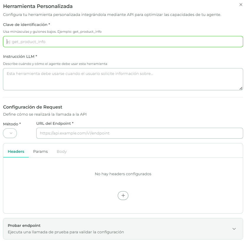 Las herramientas personalizadas permiten al agente conectarse con sistemas externos mediante API: bases de datos propias del cliente, plataformas de CRM, sistemas de validación de identidad, stock, precios en tiempo real, o cualquier otro servicio con una API disponible.