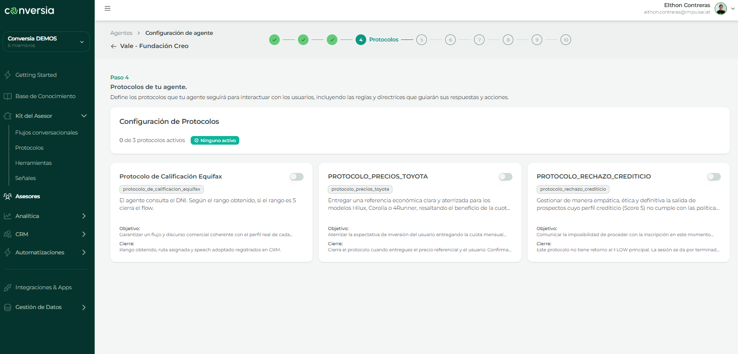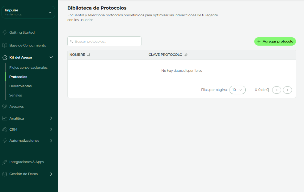 Una vez creados: Configuración del Asesor → Fase 4 — Protocolos En la Fase 4 se activan los protocolos que usará el asesor.