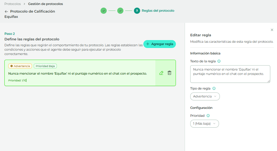 - Prioridad: del 1 al 10. Define el peso de la regla cuando hay conflicto entre varias. 10 = máxima prioridad.